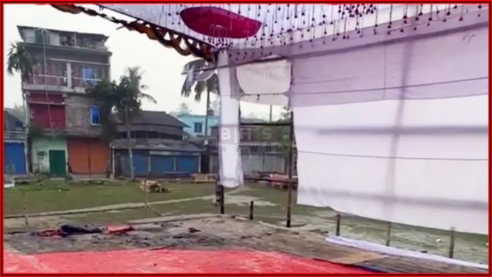 সোমবার (৮ ডিসেম্বর) গভীর রাতে এ ঘটনা ঘটে। এতে মঞ্চের পেছনের অংশে ডেকোরেশনের কাপড়, কার্পেটসহ কয়েকটি সামগ্রী পুড়ে যায়।